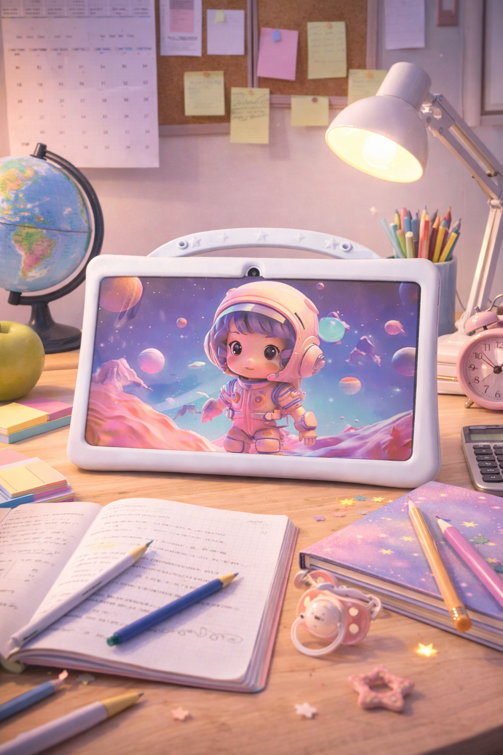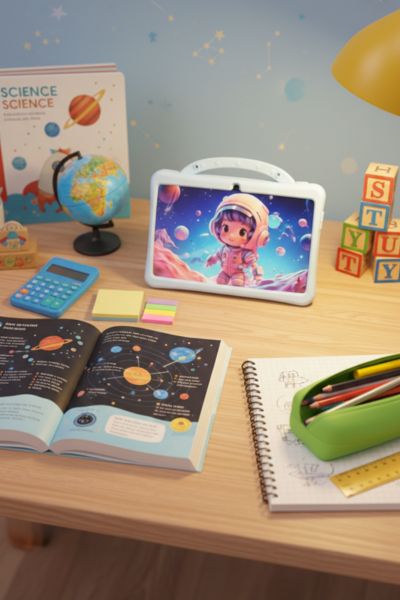This playful tablet accessory transforms your device into a fun learning station with adorable panda characters and space-themed graphics.